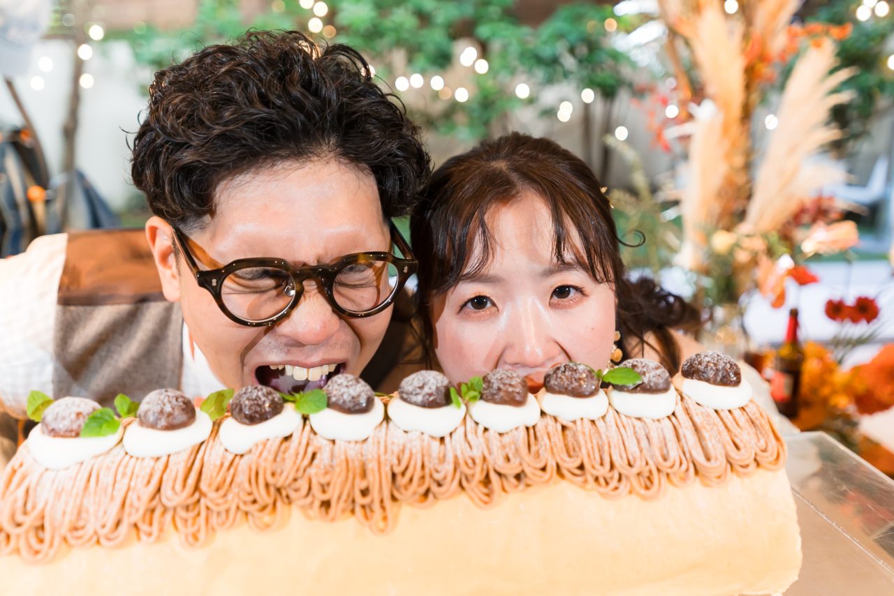 こちらのケーキに入刀していただき特大スプーンでファーストバイト