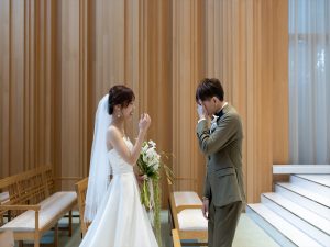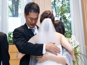 ゆりさんは扉口でお母様からベールを下ろしてもらい