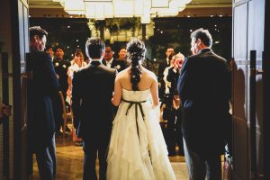 みさきさんこだわりのウエディンドレスにリボンをつけて入場です