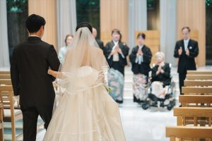 タキシードに袖を通しチャペルに入ると緊張気味のしゅんすけさん