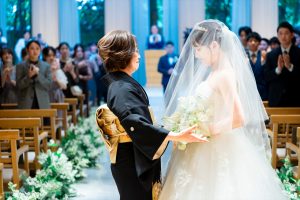 あやかさんは入場後にお母様よりベールダウンをしていただきます