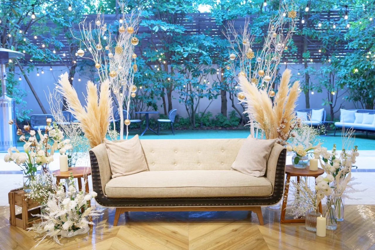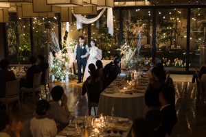 お色直し入場でのガーデンライトアップとテーブルキャンドルのコラボレーションは圧巻の美しさです